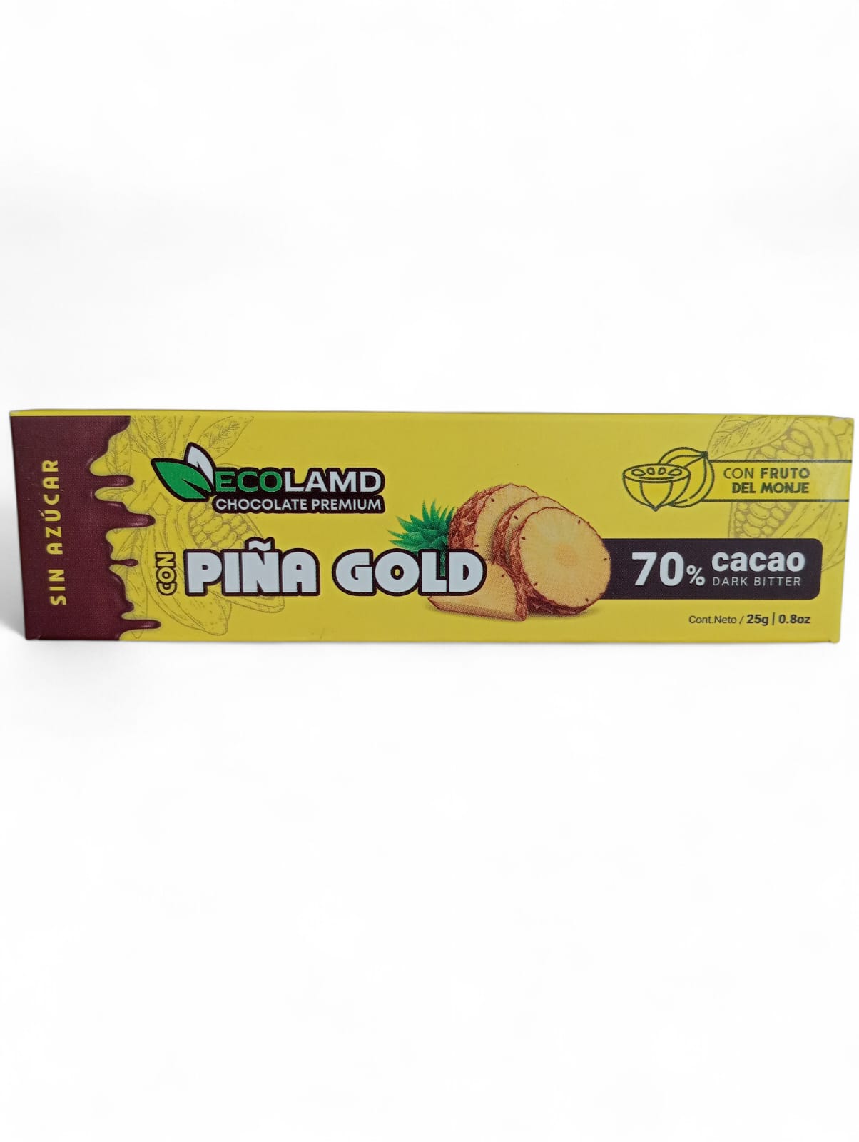 Deliciosa barra de chocolate al 70% dark bitter y endulzada con fruto del monje (libre de azúcar). Con trozos de piña golden deshidratada.