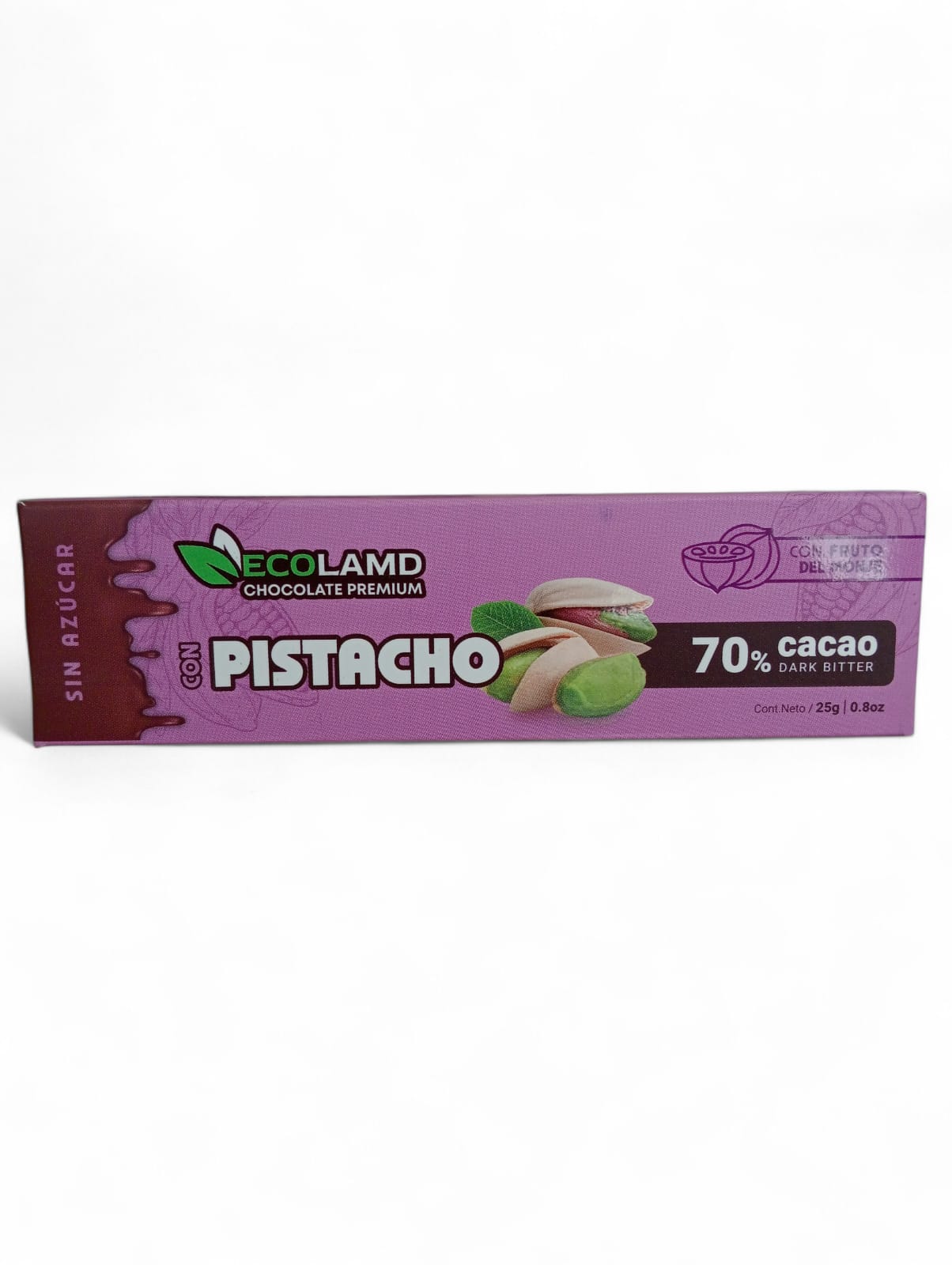 Deliciosa barra de chocolate al 70% dark bitter y endulzada con fruto del monje (libre de azúcar). Con pistacho salado.