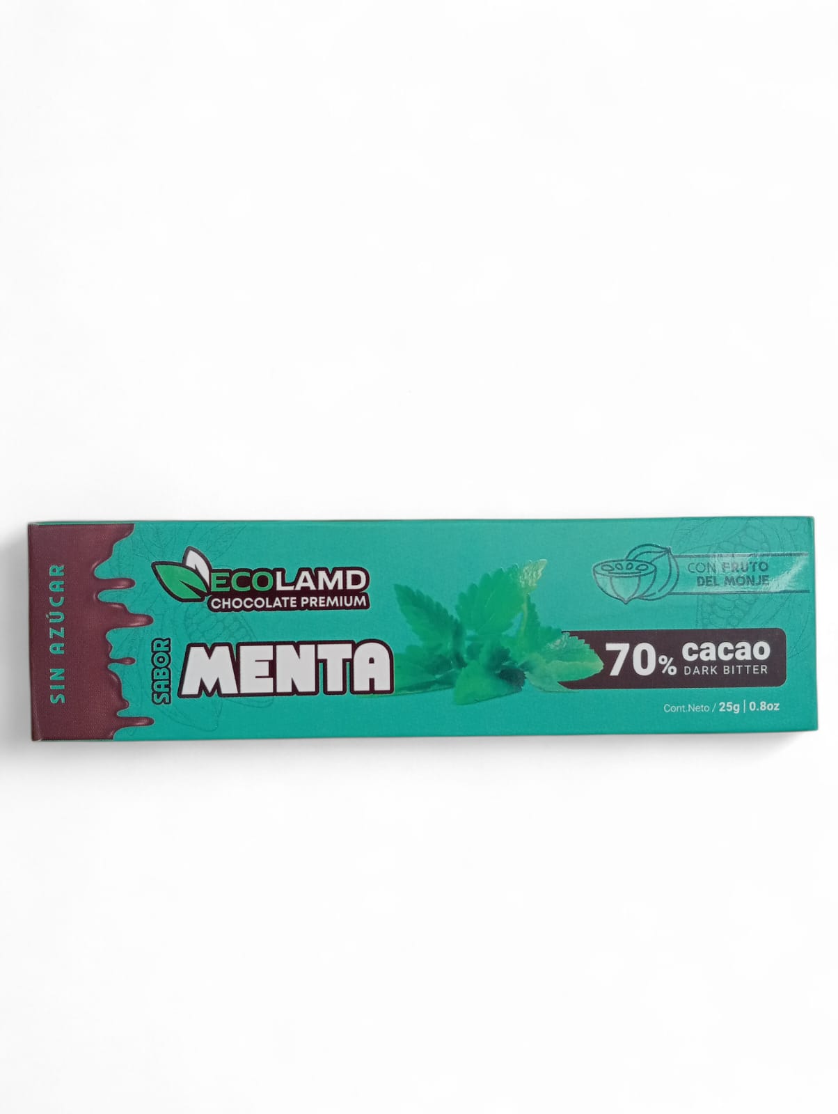 Deliciosa barra de chocolate al 70% dark bitter y endulzada con fruto del monje (libre de azúcar). Con saborizante natural a menta.